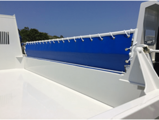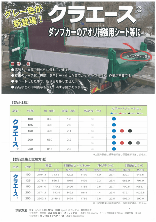 クラエース200は厚みが2.2mmとテントシートや帆布で製作されたトラックシートの数倍の厚みがあり、斜めに編み込んだポリエステル繊維を塩ビ樹脂でコーティングした、肉厚で耐久性に優れたシートです。防水性・防汚性に優れています。